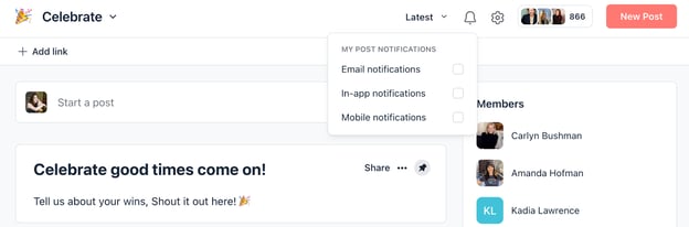 - If you want to adjust the notifications you receive from each space you have joined, simply navigate to a space and click on the bell icon in the top right corner.